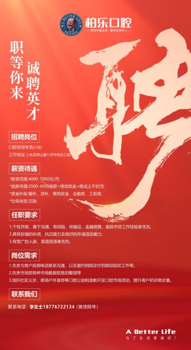 【国家二级口腔医院,招口腔咨询!】有经验/爱学习均可 高薪+弹性 工作地...